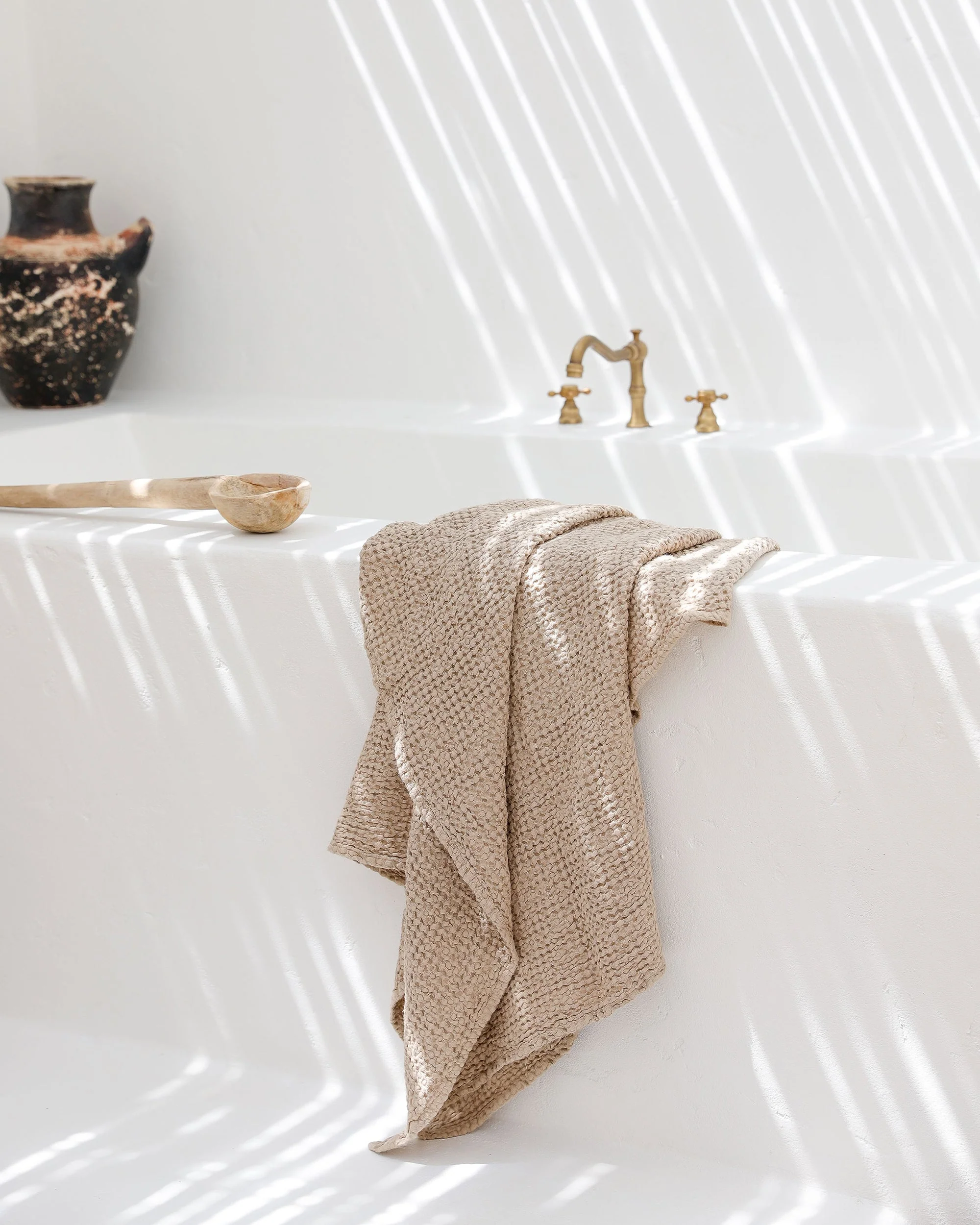 Linen-cotton blend towel set in beige color. The puffy waffle weave not only increases absorbency, but also gently exfoliates your skin. Linen is naturally antimicrobial and allows for easy airflow ensuring your towels dry quicker and stay free of mildew, germs or unpleasant odors. Wrap yourself in luxury!
