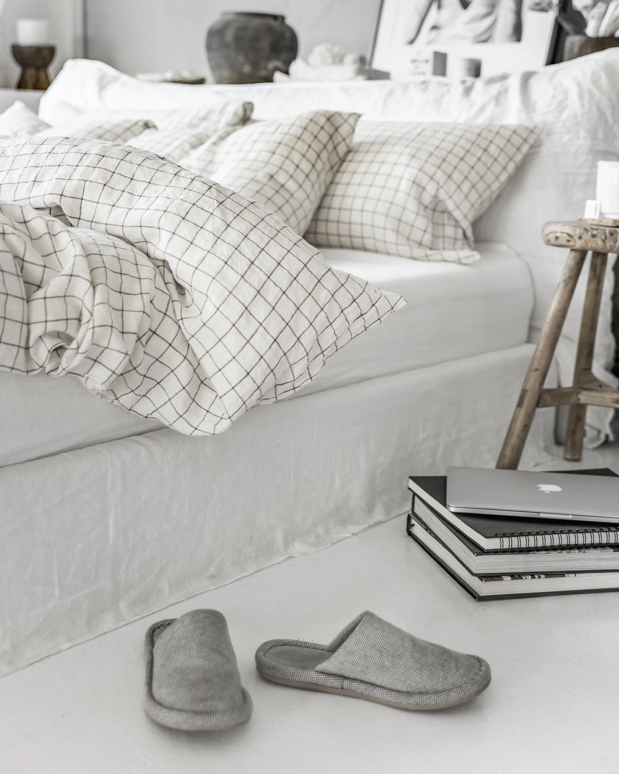 Linen duvet cover in charcoal grid (windowpane) pattern. This elegant pattern is comprised of white and charcoal gray colors to create a subtle, minimalist look. Perfect for unisex bedroom decor and easy to mix and match with other colors and patterns.