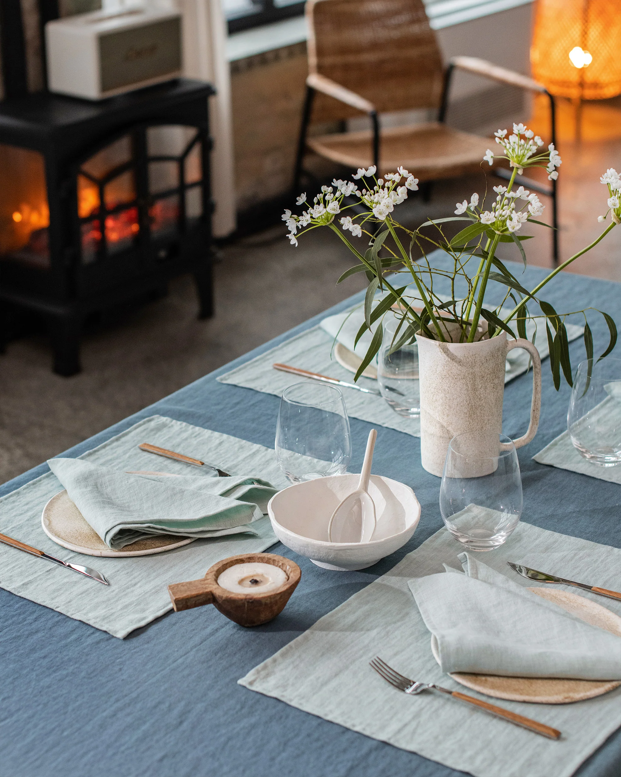 Linen placemat in dusty blue. Protect your table and dine in style with a linen placemat that is soft and easy to care for. Use it under plates when serving food or as table decorations. Perfect for mixing with tablecloths, runners, and napkins.