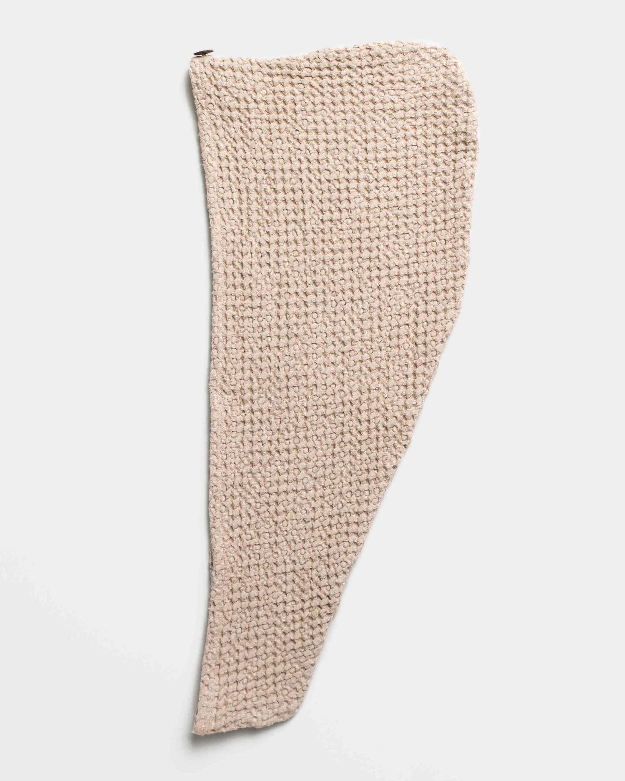 Let your hair dry in style. Our linen hair towel turban is a perfect after-shower accessory that helps your hair dry faster. Roll your hair in it and tie it up placing little loop on the button – this way you will make sure it stays fit. This hair towel turban has a waffle weave that absorbs the moisture better and wicks it up faster. Comes in beige color that means it forms a perfect match with both colorful and pastel bath robes!