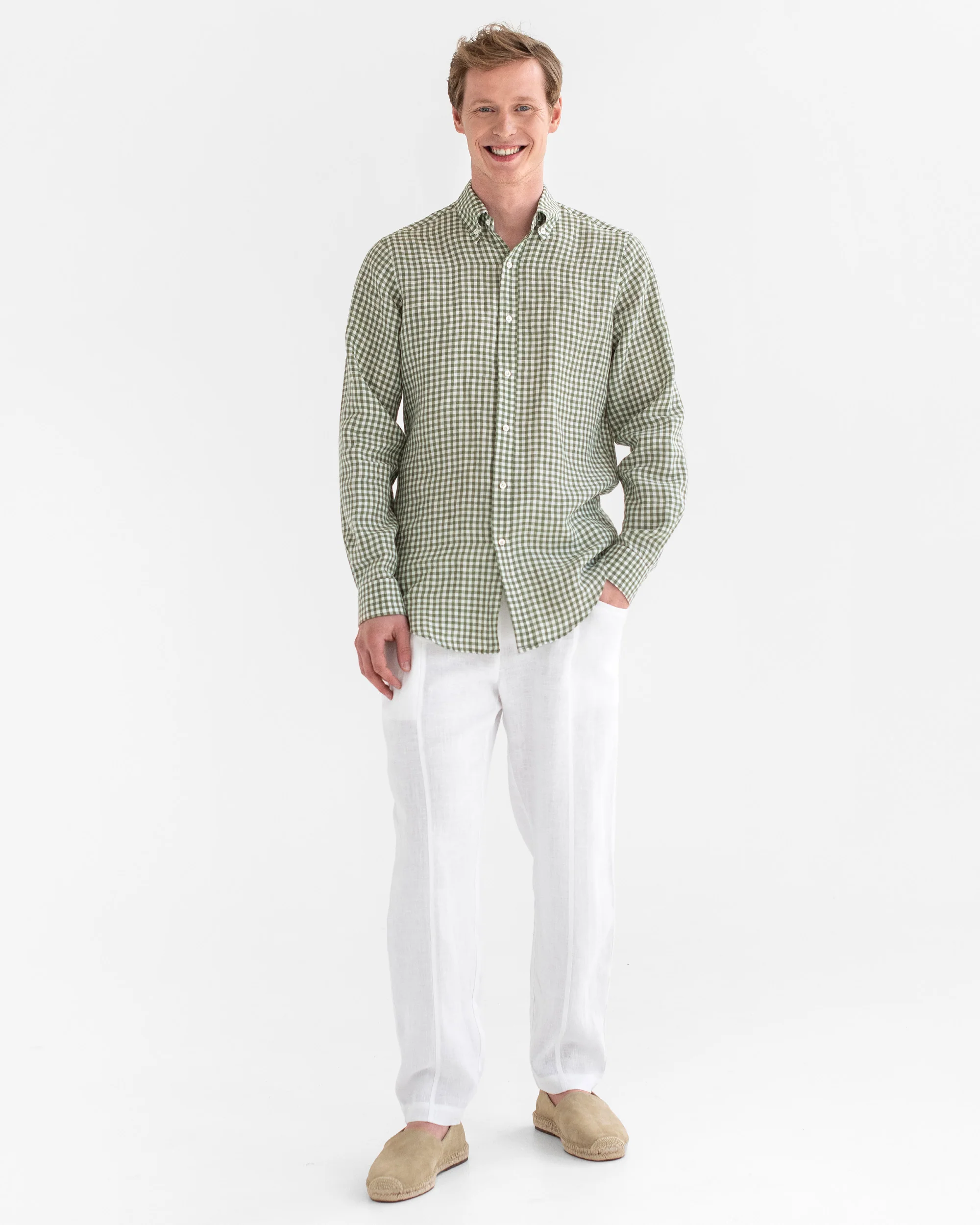 Men’s Linen Shirt WENGEN in Forest green gingham is a modern take on a classic shirt. It has all the design details of the classic shirt, but linen fabric makes the difference. Its texture looks interesting and leaves more styling options – you can tuck it into the pants or leave it loose, roll up the sleeves, and open the top buttons. For the ultimate comfort and classy look pair it with linen pants.