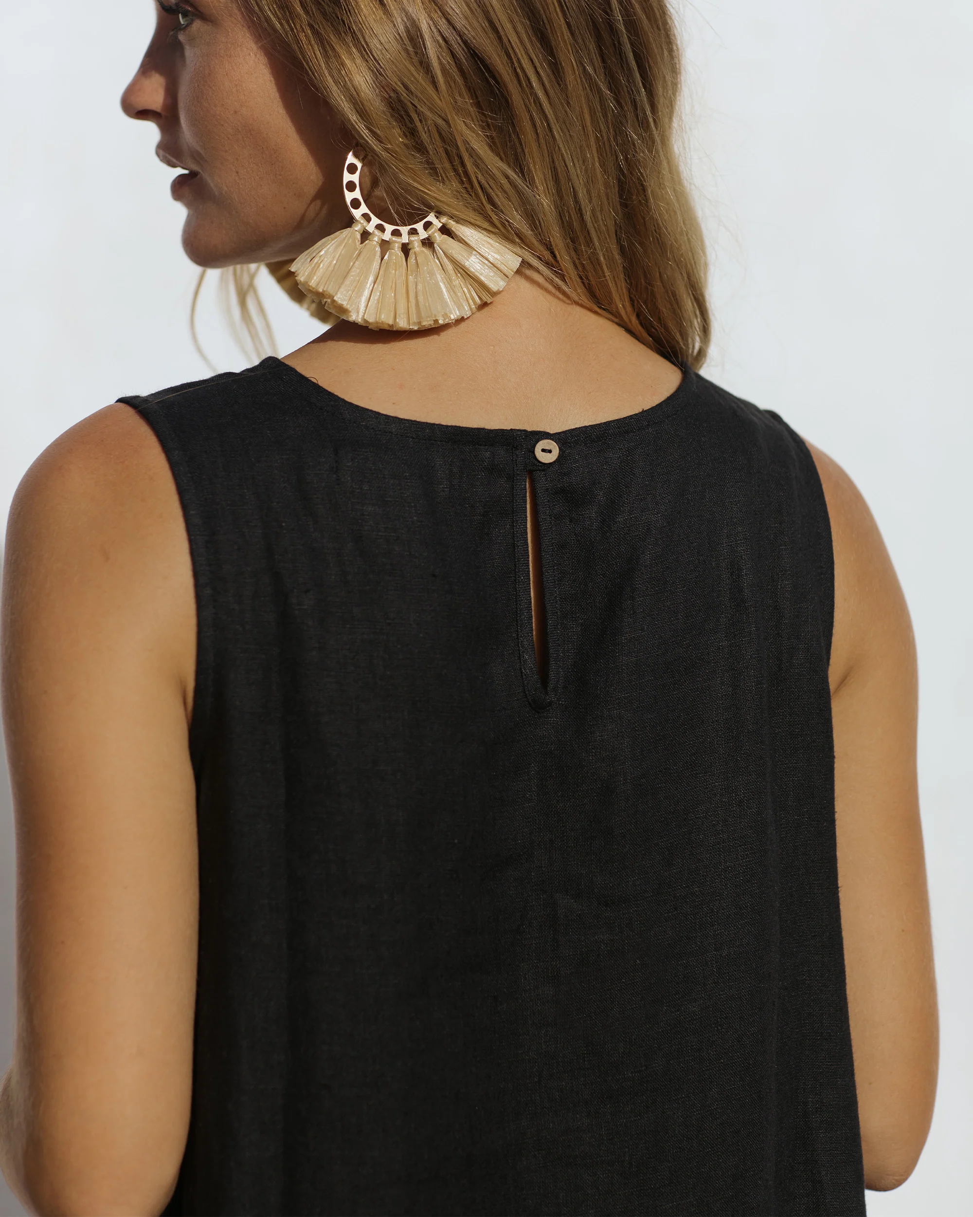 Sleeveless linen dress TOSCANA has become an overnight sensation after it was spotted on Meghan Markle. This dress is designed to have a relaxed, loose fit and features an asymmetrical high-low hem, two side pockets, and a coconut button closure on the back. Breathable, lightweight, and effortlessly stylish, it’s destined to become your wardrobe staple.