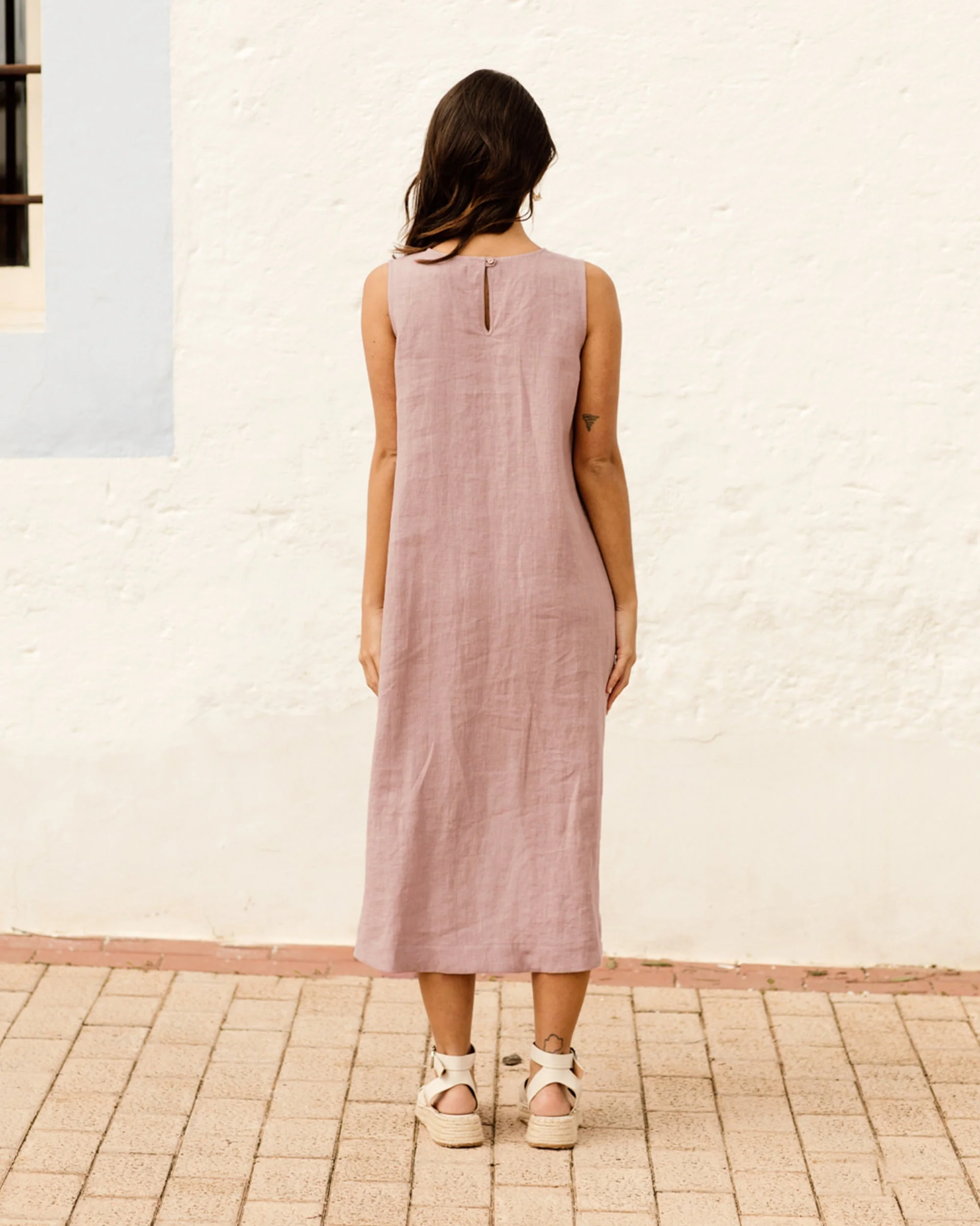 Sleeveless linen dress TOSCANA has become an overnight sensation after it was spotted on Meghan Markle. This dress is designed to have a relaxed, loose fit and features an asymmetrical high-low hem, two side pockets, and a coconut button closure on the back. Breathable, lightweight, and effortlessly stylish, it’s destined to become your wardrobe staple.