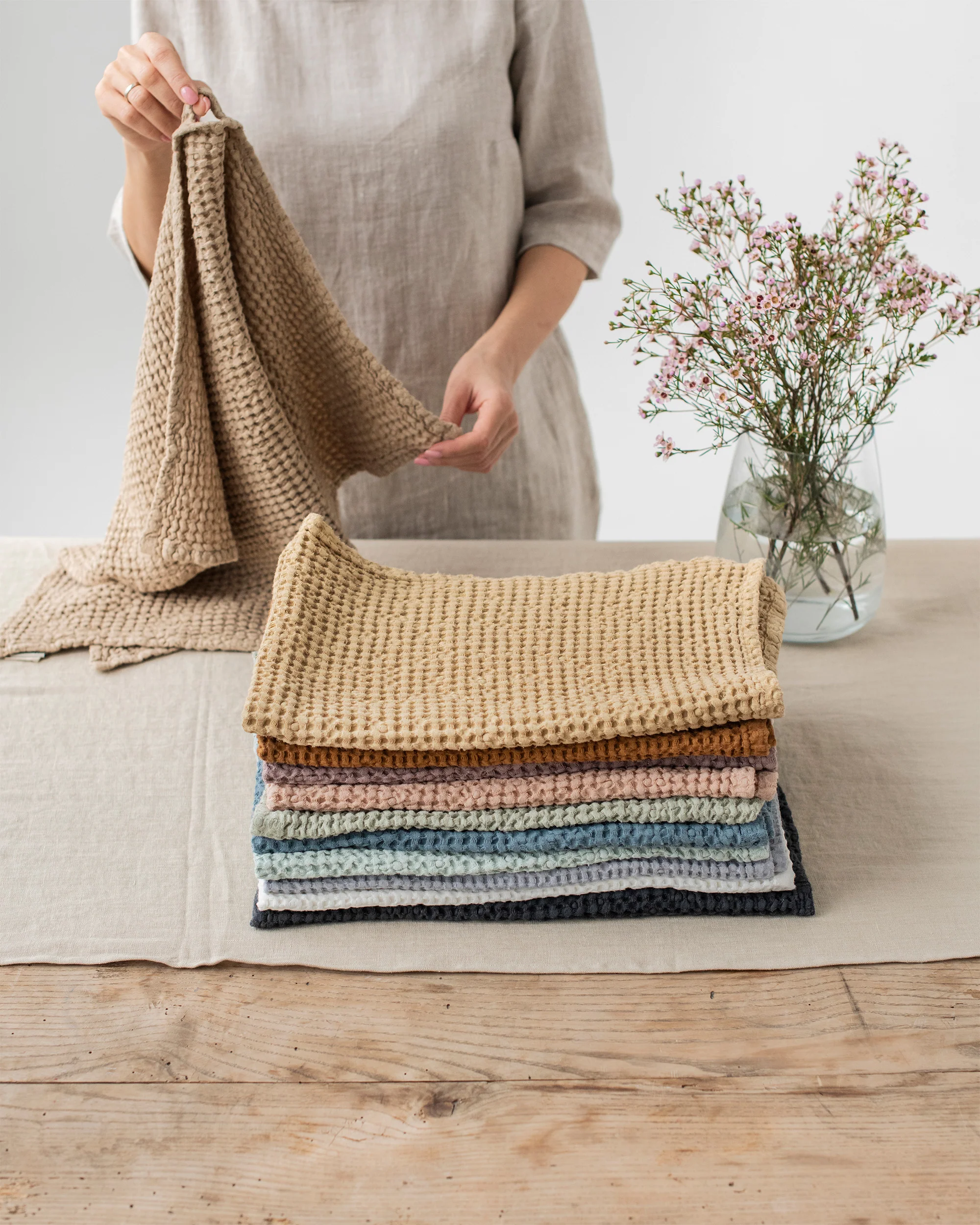 Your favorite linen-cotton blend waffle towels are now available as kitchen towels. Linen is naturally antimicrobial and allows for easy airflow ensuring your towels dry quicker and stay free of mildew, germs or unpleasant odors, and the puffy waffle weave increases absorbency.